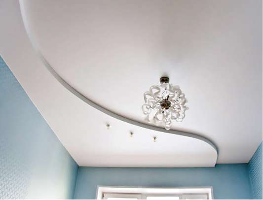 Если натяжные потолки смонтировать в систему из нескольких уровней, то их декоративные свойства становятся ещё более выраженными.
