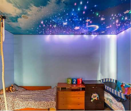 Натяжной потолок в комнате ребенка практичное решение, так как испортить его сложно, но все таки возможно. Большой выбор расцветок позволяет использовать смелый и классический дизайн.